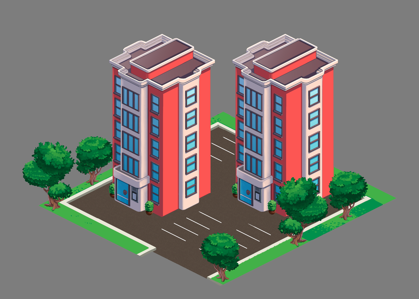 Muito material e outros projetos foram desenvolvidos, mas aqui separo exclusivamente os buildings da V1 do game, que são as primeiras entregas de construções e imóveis que guiaram muito da identidade geral do jogo.